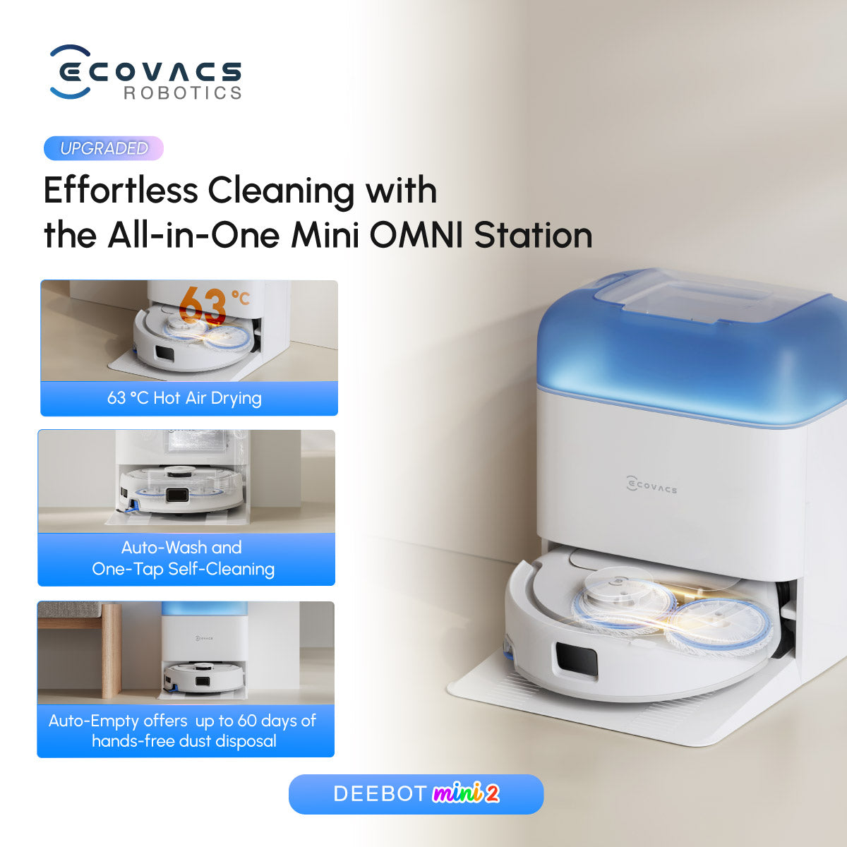 π Same ultra-compact omni station that fits anywhere β Comes with 63Β°C hot air drying, auto mop wash, auto dust empty & one-tap station cleaning.